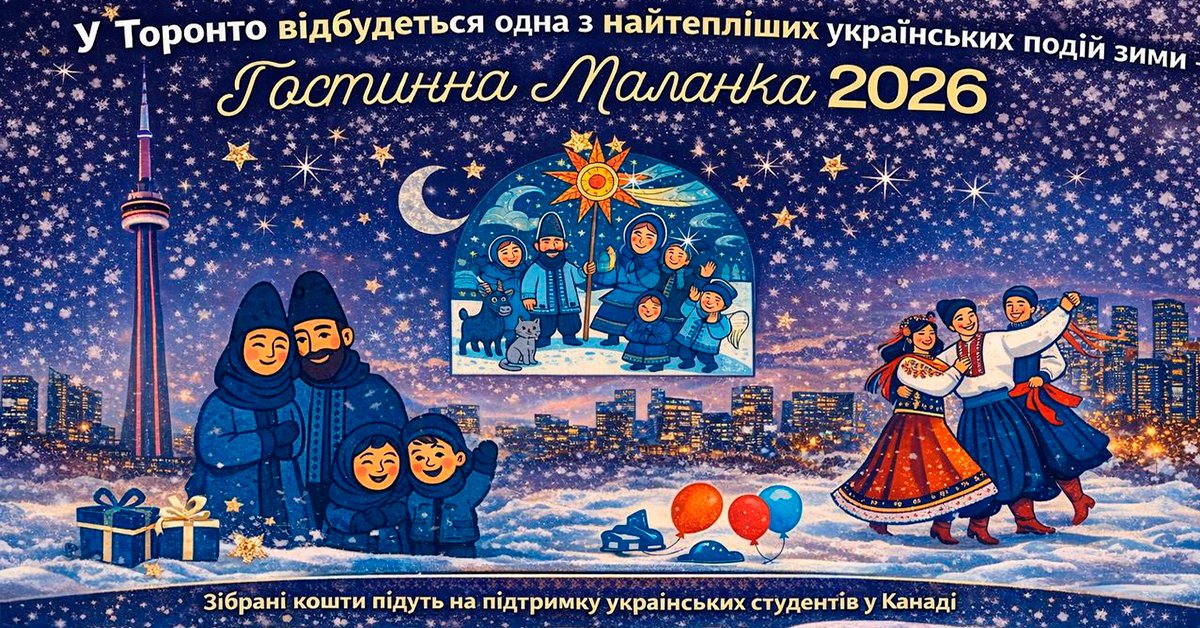 Відвідайте Гостинну Маланку 2026 у Торонто 24 січня! На вас чекає вишукана вечеря, жива музика та розваги для дітей у Trident Banquet Hall. Підтримайте українських студентів разом з нами.